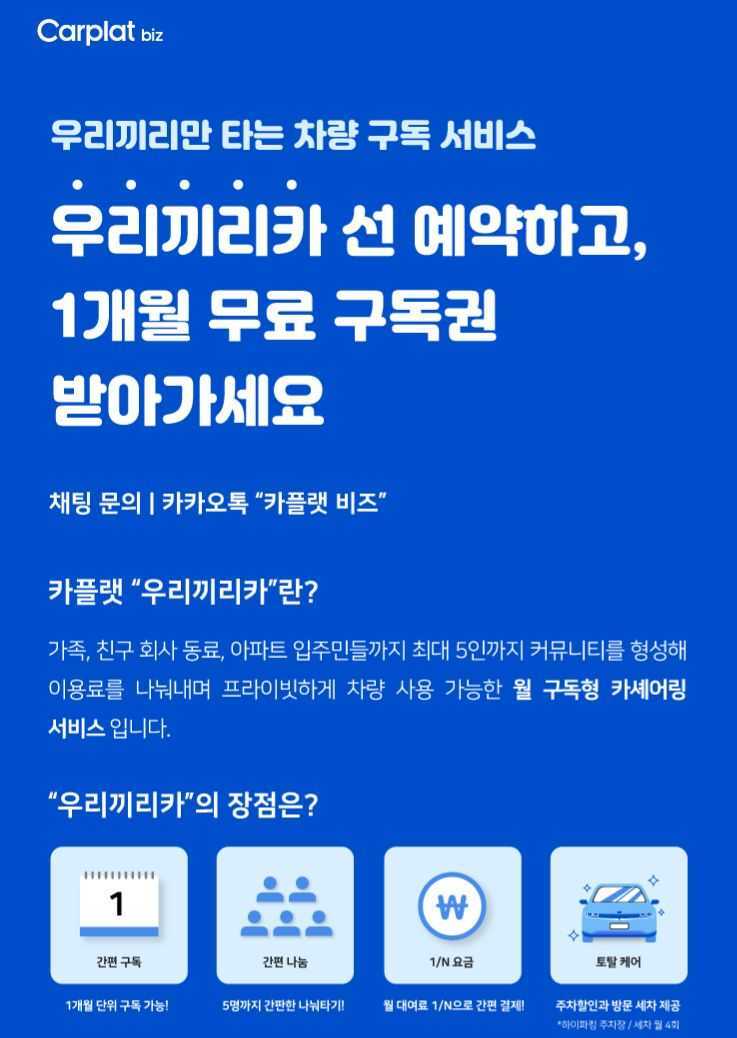 카플랫은 본격적인 ‘우리끼리카‘ 출시일인 7/29일 이전까지 사전 예약 이벤트를 진행한다. 사연을 접수한 고객 5명에게 ‘우리끼리카’ 1개월 무료 구독권을, 10명에게 구독료 50% 할인쿠폰을 증정하며 선 예약을 진행한 모든 가입자에게 스타벅스 커피쿠폰을 증정한다.